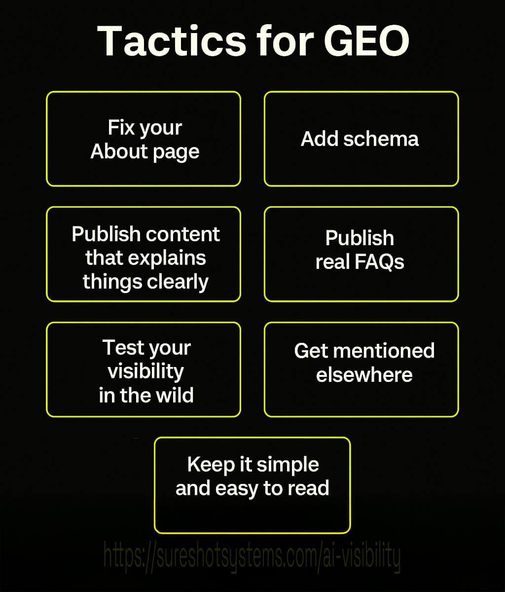 That means showing up with the kind of content actually helps. Clear service pages. Honest FAQs. A story that makes sense. When LLMs scan your site or stumble across your name on Reddit or in a blog post, they should have no doubt about what you do or why it matters.