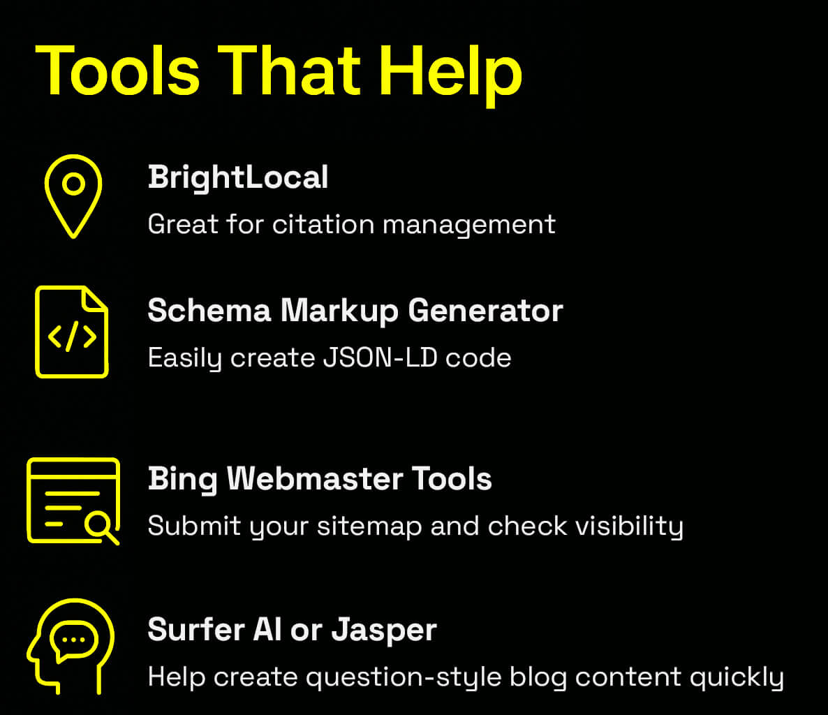 Use LocalBusiness, FAQPage, and Service schema markup to help LLMs understand your site